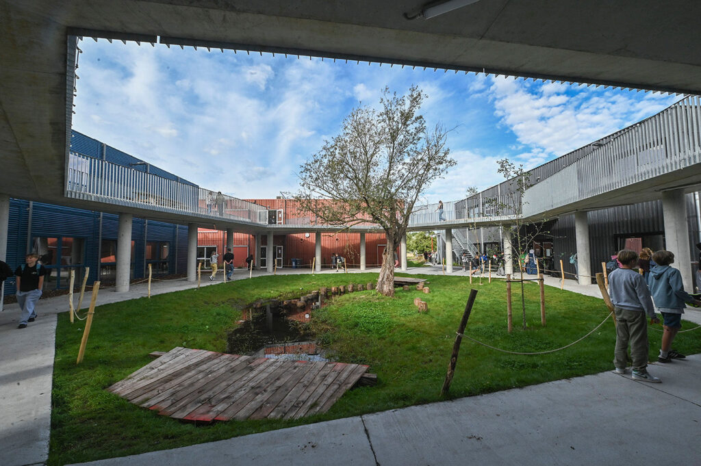 Blikvanger van de campus is de zeshoekige passerelle die alle gebouwen op de eerste verdieping met elkaar verbindt. Ze vormt niet enkel een circulatieruimte met één centrale lift voor alle leerlingen; ze is tegelijk het architecturale hart van de school. “De passerelle verbindt letterlijk én figuurlijk onze school,” zegt Fiers. “Ze staat symbool voor ons streven: een dynamische interactie tussen leerkrachten, leerlingen en ideeën.” Ook esthetisch is het een sterk signaal. De transparante structuur symboliseert openheid en continuïteit, en maakt de campus tot een herkenbaar geheel. Rond de gebouwen zorgen groen en licht voor een rustgevend kader, inclusief een karaktervolle boom die bewust behouden bleef als symbool voor duurzaamheid.